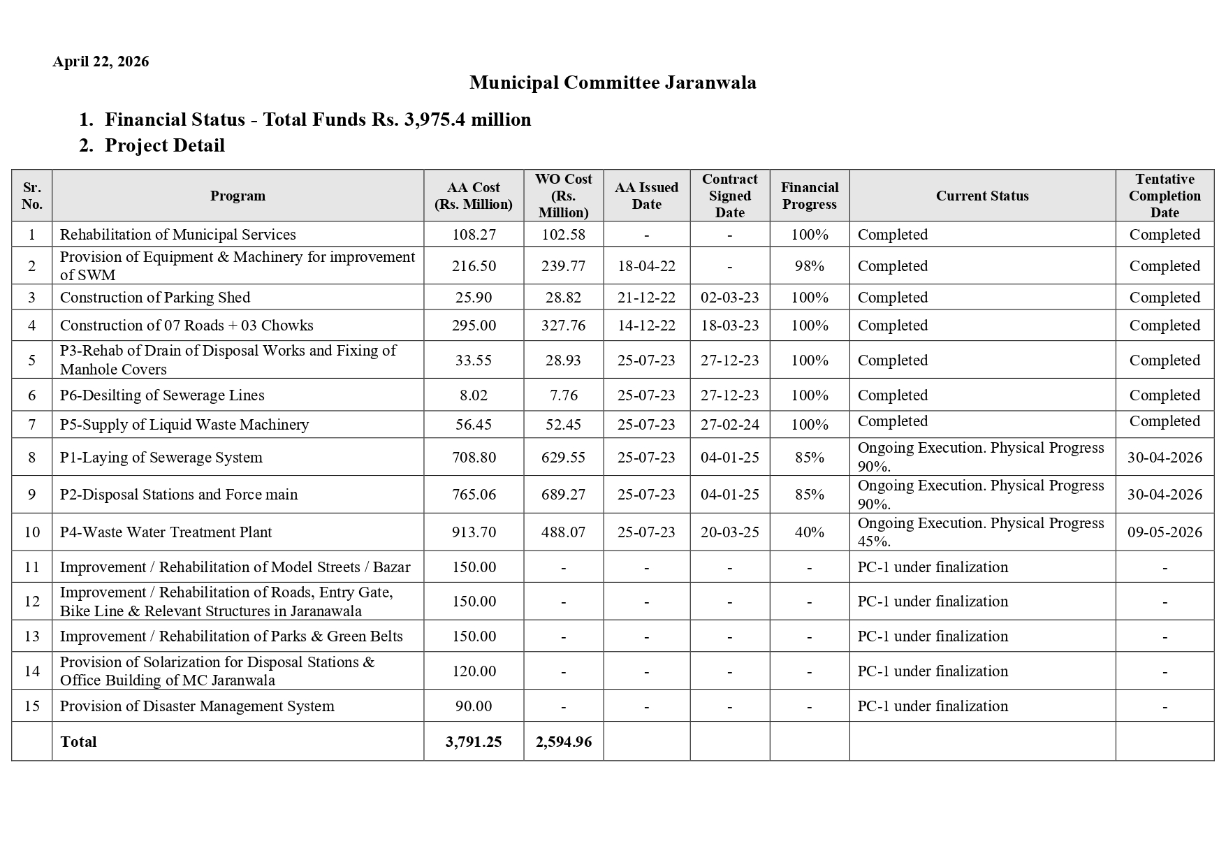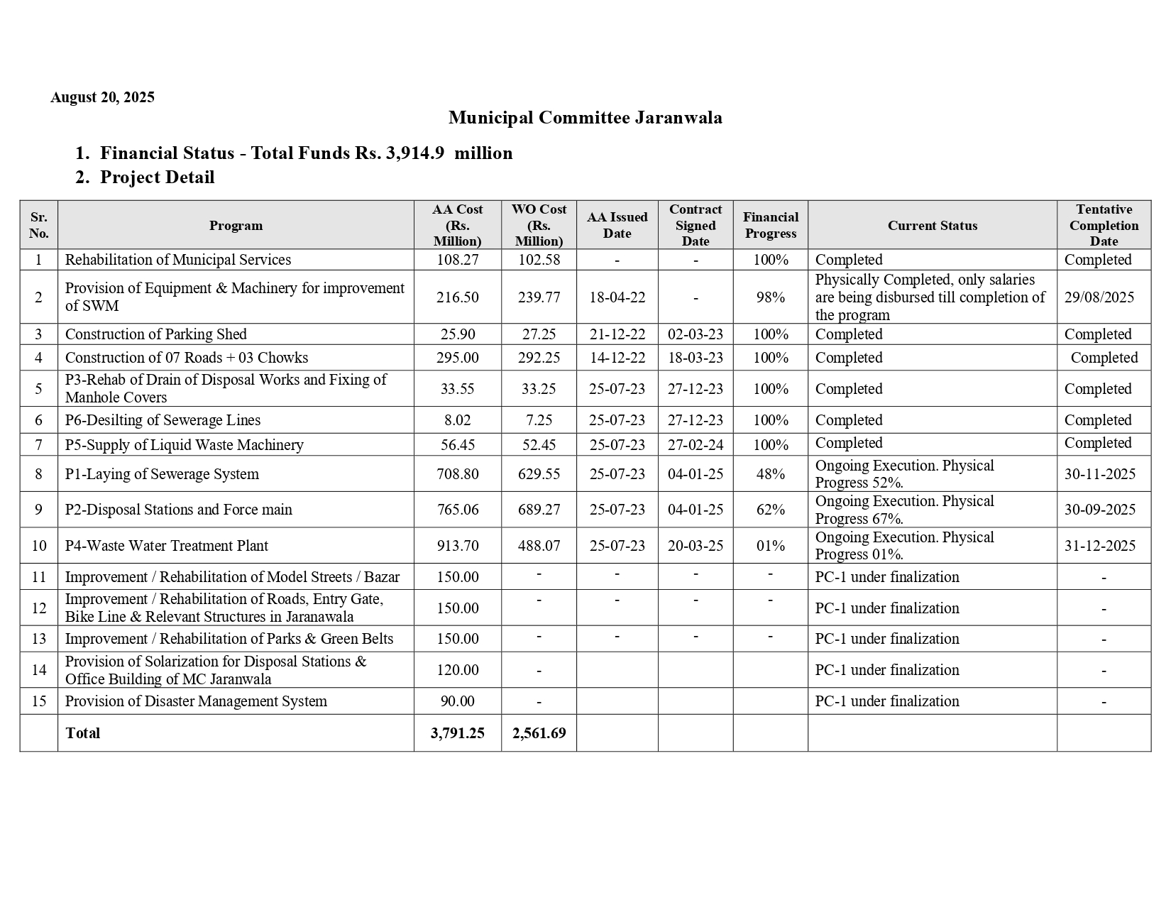 PCP Infrastructure Sub Projects Detail